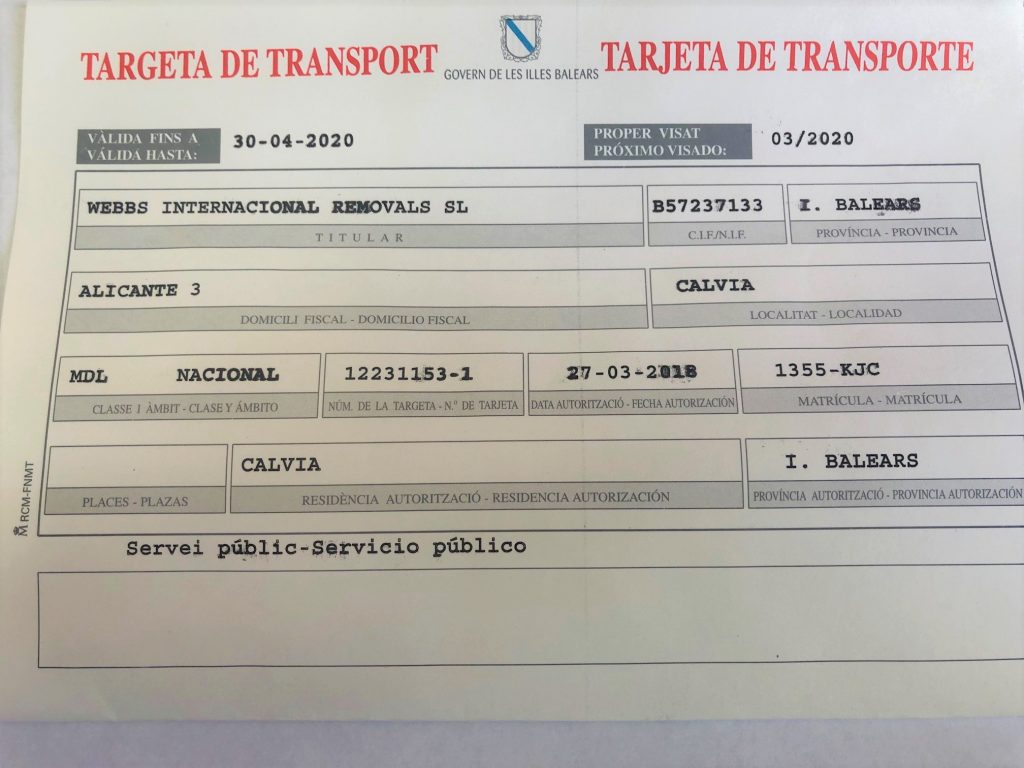 Webbs International Removals SL holds a “National” Spanish Transport Licence for vehicles up to 3500 kgs. At Webbs depot in Mallorca we have seven Spanish Registered Vehicles which are primarily used for the local collections and deliveries to and from our UK Prime Mover.